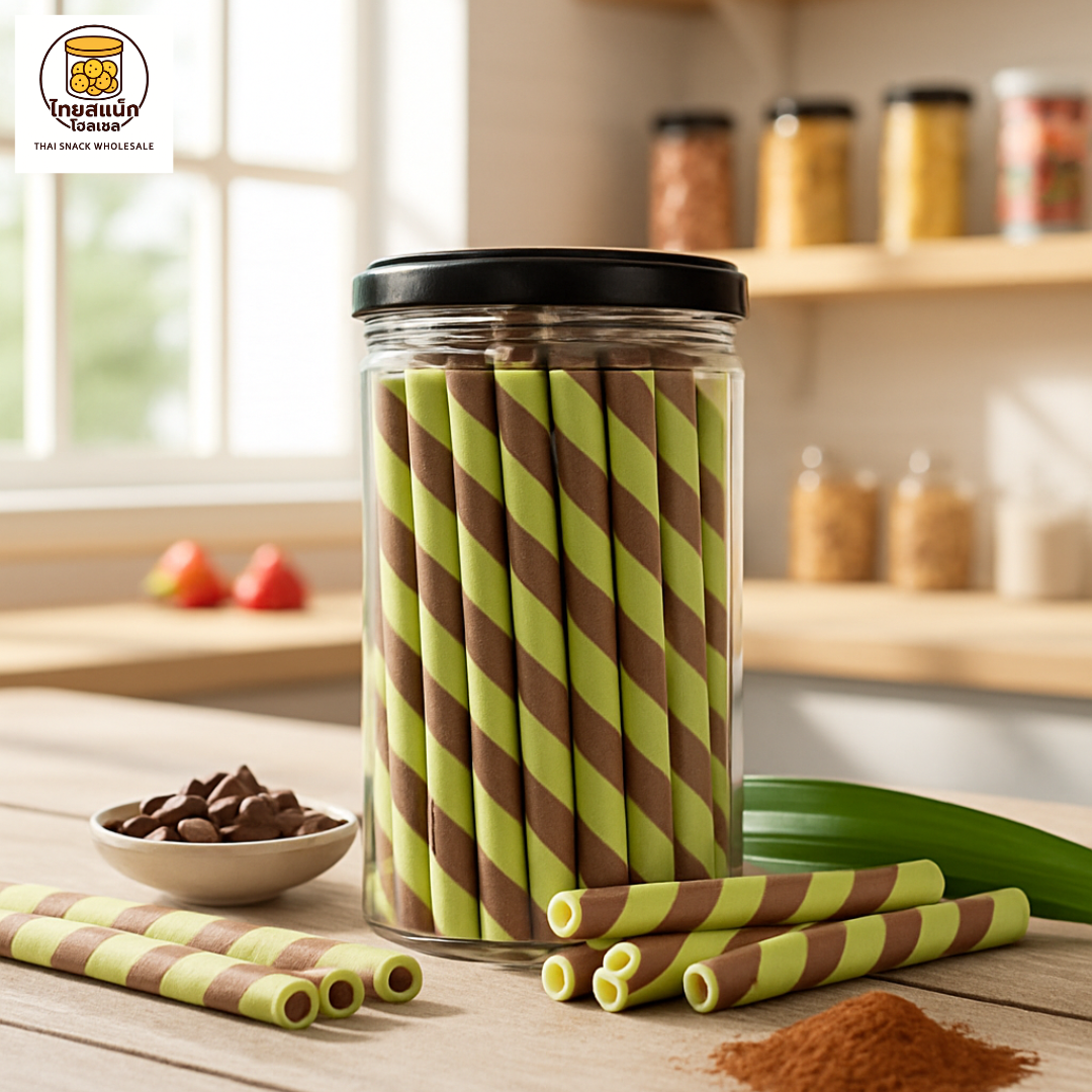 สัมผัสความกรอบ หอมละมุนของใบเตย ผสานกับความเข้มข้นของช็อกโกแลตอย่างลงตัว! เวเฟอร์โรลลายเกลียวสีเขียว-น้ำตาล ที่จะทำให้คุณเคี้ยวเพลินจนหยุดไม่ได้!